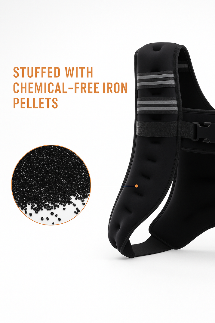 The Veloura Weighted Vest is made from high-quality, breathable neoprene material and filled with chemical-free iron pellets for safe, balanced weight distribution.
